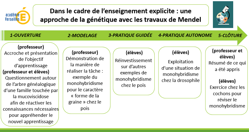 * **Dans le cadre de l’enseignement explicite : une approche de la génétique avec les travaux de Mendel** : Monohybridisme, croisements expérimentaux, première loi de Mendel, deuxième loi de Mendel, méiose, haploïdie, diploïdie, homozygotie, hétérozygotie. En 1865, le moine morave Gregor Mendel rendait publique sa découverte des lois de l’hérédité, à une époque où ni les gènes, ni la méiose, ni les chromosomes n’étaient connus. Dans cet article, on propose de recourir à l’enseignement explicite pour découvrir et exploiter les deux premières lois de Mendel.Un article à découvrir sur le site de [l'académie de Versailles](https://svt.ac-versailles.fr/spip.php?article1395).